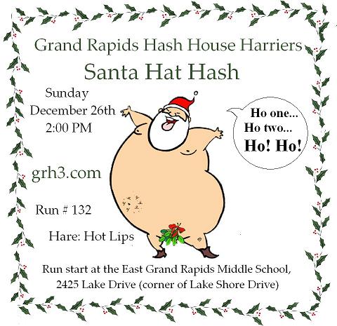 Run Review: Ahhh the sun is shining upon us - love it!!!! Our very own Religious Advisor Ponygirl from Saugatuck arrived at the hash bringing the sunshine. Also, he brought Boxing Day and the Full Moon to us - thank you and thank you. As hashers arrived I as the hare took off quickly to set out the beverages for the beer checks out on the trail. Dam, so many EGR cops out there couldn't set out the liquids for the last check. Arriving back at the parking lot chalk talk was had quickly and so was Father Abraham. All had been given Santa hats if not brought and shots of schnapps were consumed to warm our innards.